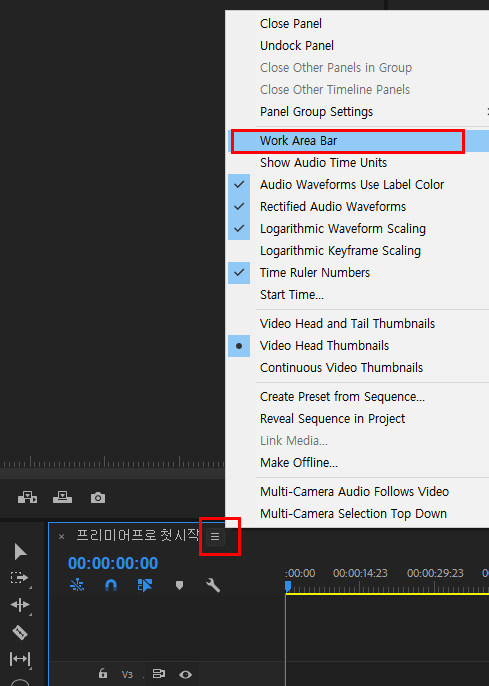 작업 영역바가 설정되어 있디 않다면 [Timeline] 패널 오른쪽 위의 옵션을 클릭하고 [Work Area Bar]를 선택한다.