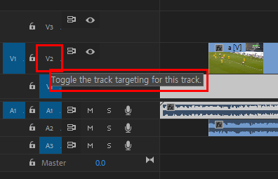 소스(Source)패널에서 작업한 영상 소스를 타임라인(Timeline) 패널로 직접 드르그하지 않고 버튼 또는 인서트( , ), 오버라이트 ( . )로 추가하거나 프로그램(Program) 패널로 드래그하여 추가할 때 클립이 배치될 트랙을 선택하는 것이다.