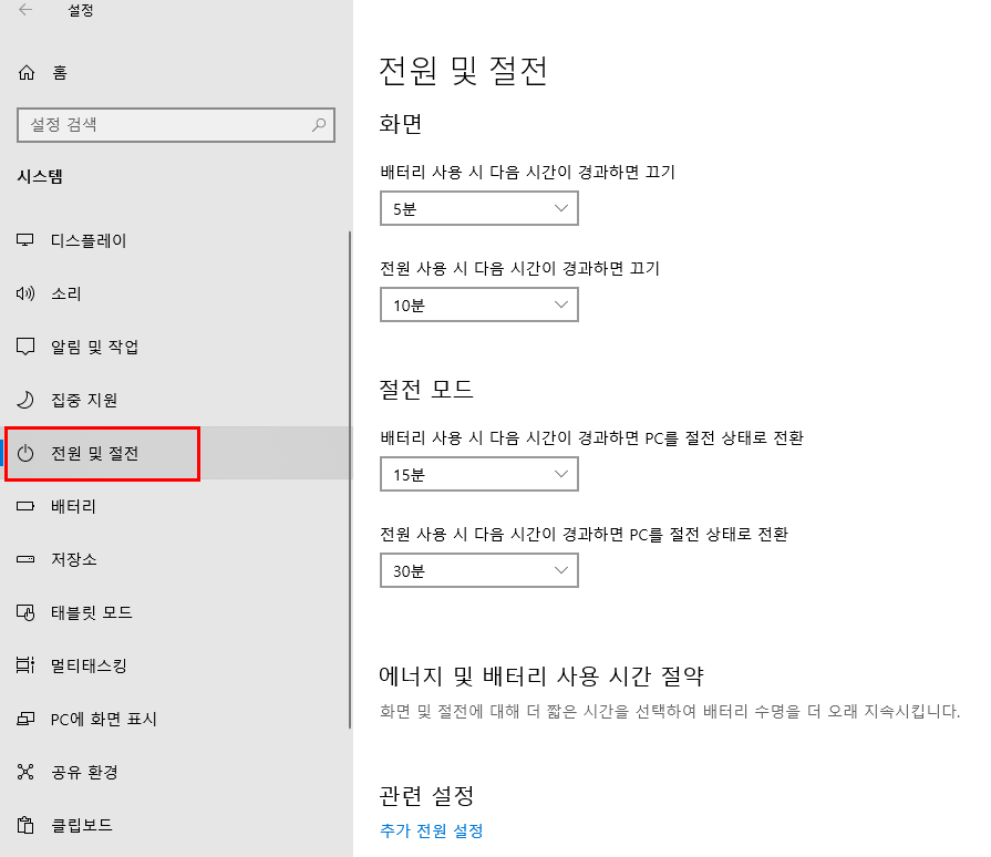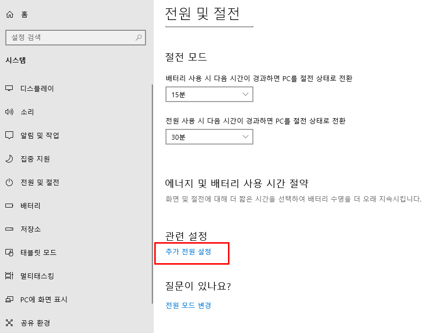 전원 사용 - [ 아무 것도 안함 ] 으로 변경하면 됩니다.