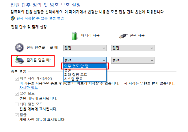6. 덮개를 닫을 때 - [ 절전 ] 에서 [ 아무 것도 안 함 ]으로 변경